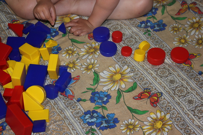 Сначала мы их рассмотрели, я рассказала Кате, что фигурки все разные: и по цвету, и по размеру, и по толщине, и по форме. Потом поиграли в игру "Найди такие же по цвету/форме/толщине/размеру как этот" Признак толщины ей пока дается хуже других, но вообще блоки понравились, долго Катейка из них детские площадки для зверей строила )