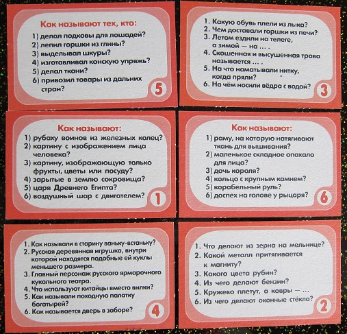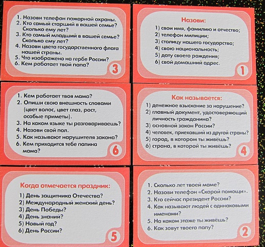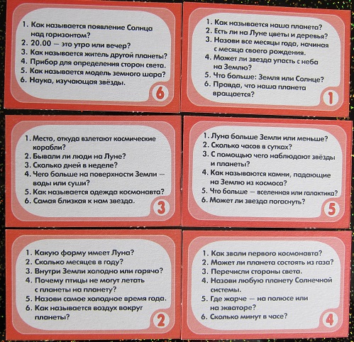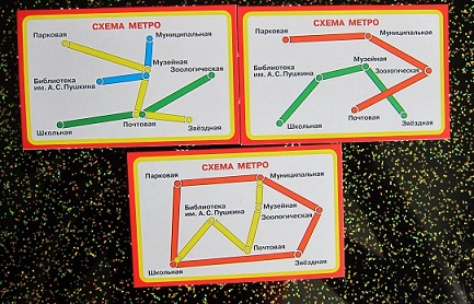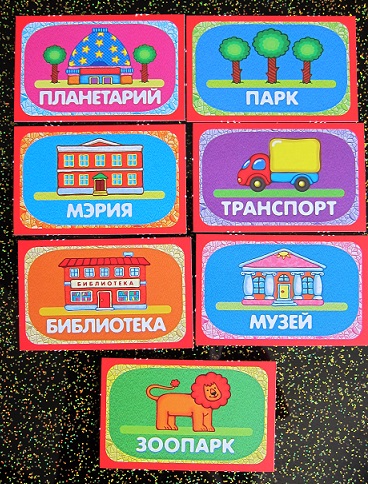 3. Игра "". Это интеллектуальная ходилка. Играть могут от 2 до 6 игроков. Игра длится около 30 минут. Цель игры - совершить прогулку по городу, посетить в любом порядке все объекты (всего их семь) и первым вернуться в школу, откуда и начинается игра. Есть несколько вариантов игры: пешая прогулка, пешая + автобус, пешая + автобус + метро. Мы пока освоили первый вариант. Итак, выходим из школы по желтому тротуару и заходим в каждое учреждение. Заходим не просто так. А отвечаем на вопрос. Для каждого объекта есть карточки с вопросами. Если ответ верный, то кладем свой жетон на объект и двигаемся дальше. Если ответ неверный, ждем своего хода и снова отвечаем на новый вопрос и так пока не будет одного верного ответа. Вопросы очень разные. Есть сложные для сына, есть простые. Я сфотографировала карточки с вопросами (см.ниже).