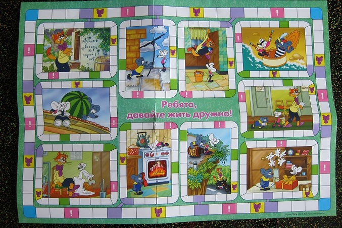 2. Игра ". Покупала в май-шопе. Сейчас ее нет в наличии, но возможно вот точно такая. Игра долгая, около 30 минут. В игре могут принять участие от 2 до 4 человек. Цель игры - занять как можно больше секторов на поле. Игроки стартуют с синей клетки с любого угла поля. Двигаться можно в любом направлении. На пути встретятся клетки "Бант" (получаешь маленькую карточку с изображением бантика, которая в любой момент игры позволяет прибавить или убавить к показаниям кубика одно очко), "Восклицательный знак" (берешь карточку "Сюрприз", которая может отправить тебя на определенную клетку или забрать/подарить карточку с бантом) и фиолетовые клетки перехода. Когда ты попадаешь на фиолетовую клетку перехода, то по желанию можешь сделать переход с основного поля в сектор. Сектор считается занятым тобой, когда ты остановишься на зеленой клетке в секторе. В этом случае ты получаешь две карточки с изображением Леопольда: одну кладешь на середину сектора, вторую берешь себе. Игра заканчивается, когда заняты все сектора. Выиграл тот участник, у кого больше карточек с Леопольдом, т.е. тот кто занял больше секторов.