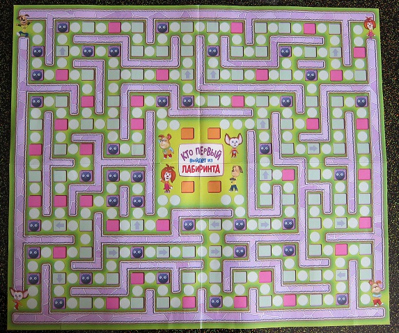 1. Игра "". Играть могут от 2 до 5 игроков. Цель игры - вывести своего персонажа из лабиринта к "своему" выходу. Дорогу выбираешь сам (кроме первого нескольких ходов, когда выходишь с середины), идти можно в любом направлении, т.е. один ход можешь пойти направо, а следующий ход налево. На пути встречаются три знака: черные кошки - пропуск хода, стрелка - обязательно следующий ход идти в указанном направлении (часто для тебя невыгодном), розовый квадрат - дополнительный ход. Лабиринт небольшой, игра длится недолго, всего 5-10 минут. Есть один минус - наикратчайшие пути выхода из лабиринта для участников неравноценны. Один путь на 10 клеток меньше остальных. Мы его сыну отдаем. Но даже это не умаляет достоинства игры: новый формат ходилки, возможность выбора направления своего хода, у каждого свой финиш.