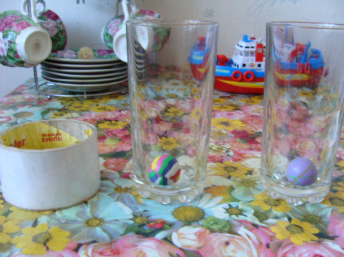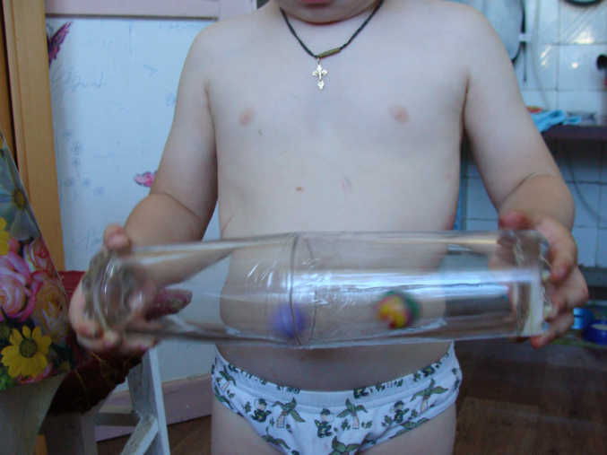 Опыт следующий. Два стакана, два мячика, скотч. Кладем мячики в стакан , соединияем стаканы и заклеиваем стык скотчем. Даем эту игрушку (как назвал ее Саша) ребенку и предлагаем разъединить мячики так, чтобы в одном стаканчике было по одному мячику.