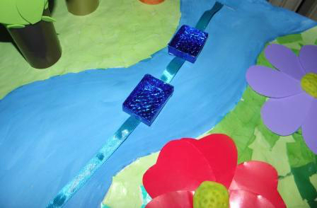 По этой речке будут плавать 2 лодочки из спичичных коробков обклеиных цветным скотчем, и пришиты они к отласной ленте