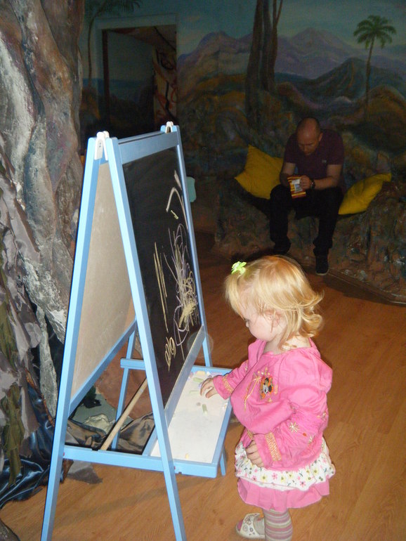 На входе называете пин код, который вам пришел смс, показываете свидетельсnво о рождении, либо запись в паспорте и проходите в театр. Запускают за 15 миндо спектакля. Вход в театр, небольшая раздевалка, где можно оставить коляску, затем зал, декорированный большим деревом, стоят стульчики для родителей, рядом чай-кофе-печенье, стаканчики. В этой же комнате стоит стол для рисования, 4 стула для детей, бумага, фломастеры, доска для рисования мелками. В общем, есть чем заняться.