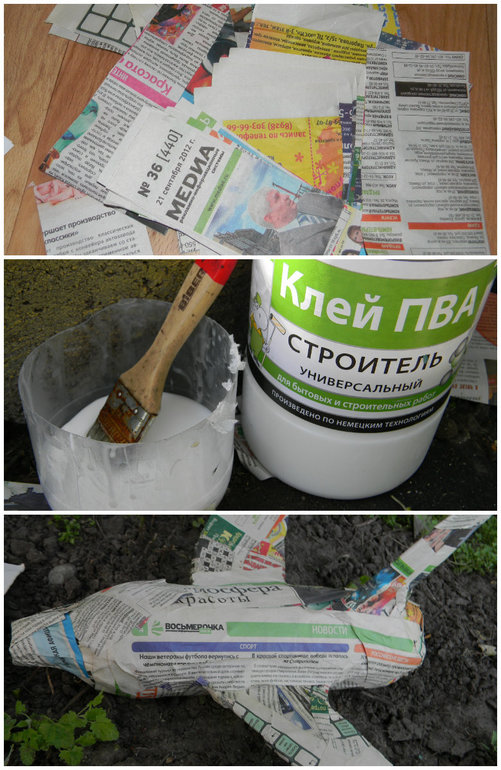 Газеты, клей ПВА, бутылка пластиковая, скотч, ножницы, белая офсетная бумага, гуашь, кисточки.