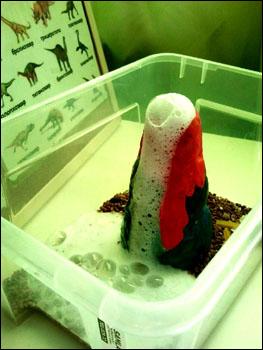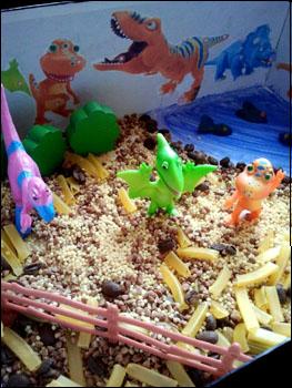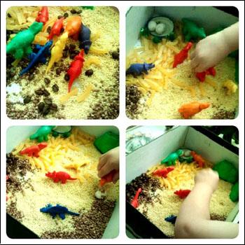 Создали и поиграли с сенсорной коробкой.Она увлекла нас минут на 20-играли в семью,разыгрывали драку между динозаврами и даже пытались кормить их макаронами))