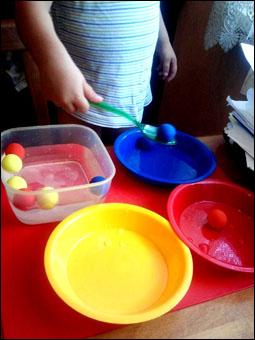 И сортировали их по цвету при помощи ложки,вылавливали из воды и раскладывали по тарелочкам,а так же искали их в крупе: