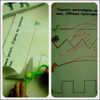 И пытались учиться резать бумагу по линии и проводить непрерывную линию (пока не очень успешно):