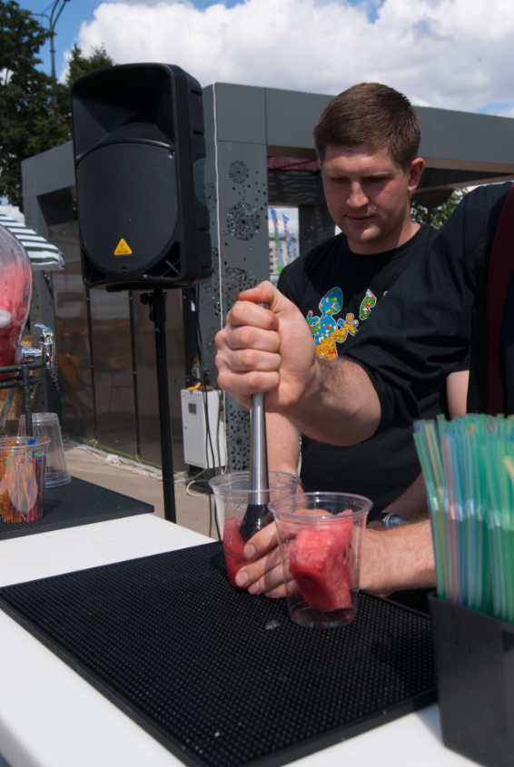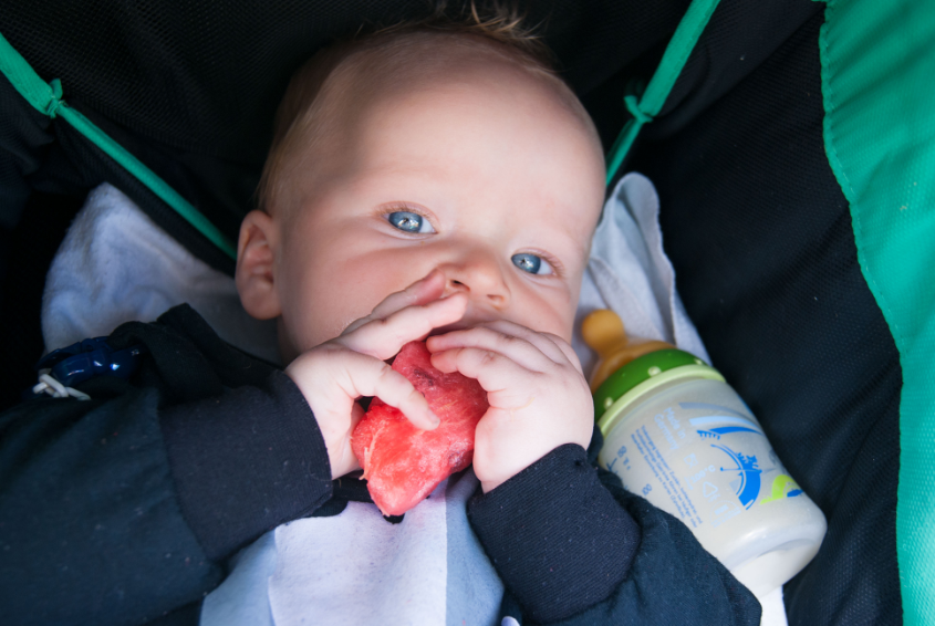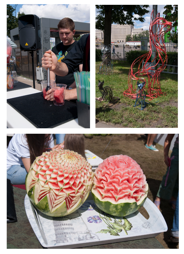 начну с младшего...Там вообще много мамочек слинго и тележного, т.е. колясочного типа. Аполлон отказался кушать и спать, при чем даже поплакал перед сном, наверно музыка мешала..или жара. На удивление синоптикам там было пекло. За все 6 часов не домашней обстановки попил молока моего, воды и сока. От еды отказался, НО на одном из стендов проходит дегустация арбузов-отведал с удовольствием. В общем где было можно-сидели валялся, пытался уползти... Но в основном на руках.