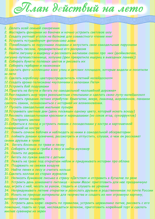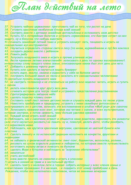 рада, если кому-то пригодится. Поздравляю, Машут, с прибавлением!!! Вам теперь веселее втроем ждать папу с работы ;-) и как раз вот списочек дел на лето пригодится)