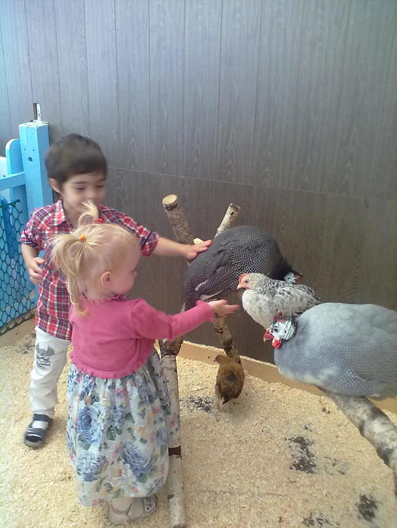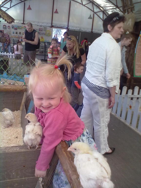 Но начну по порядку. 1 пунктом по плану был контакный зоопарк Жили у бабуси, куда мы рванули, находится он около 66 павильона, рядом с ним Крокодиловая ферма. Ну что, в общем то это 2 крытых больших шатра чтоли, вход в мини ферму стоит 200 руб, для ребенка бесплатно. Из животных, куры, куропатки, северный олень, который бодался, овцы, гуси или утки, попугаи, цыплята, морская свинка, которая спряталась, кролики похожие на зайцев, во все вольеры свободный доступ. Мы ходили ко всем, кроме оленя и коз, которые тоже бодались)) Корм для них стоит +50 руб, мы не брали. Попугаи мне показались немного не в адеквате, я почему то привыкла, что они чирикают и летают, а эти почему сидят в основном на жердочках и молчат, цыплята вообще бегают от вольера к вольеру, особенно почему то у оленя, когда мы вошли в вольер к пернатым, честно признаюсь один из них улетел на волю и почему то приземлился к цыплятам, это было так смешно, он не полетел на улицу, а именно сел у своих друзей и стал там ходить и чирикать что то. Никто нас за это не убил. Олень с одной стороны почему то был толи общипан, толи затерт)) я не поняла, овцы вообще легли и лежали после видимо сытного полдника, цыплят я думала увидеть желтыми, но они были тоже странноваты, но в общем то все мило. Еще в подарок дают маленькую прималенькую фотку вас с любым животным, в основном это конечно кролик) За доп плату, можно напечать 10х15, это 200 руб, и еще за 250 руб можно скинуть 5 кадров на ваш тел или флешку если есть. На мое замечание «Ну вы и дерете» фотограф сказал, что кушать хочется всем, согласна в принципе. Не скажу, что там можно провести больше часа, помещение маленькое и на самом деле простора особо нет, а если это выходной, то скорее всего там давка и вообще не пролезть. Так что выбирайте будни и не ждите чего то мега особенного, в этом плане парк Воробьи это рай.