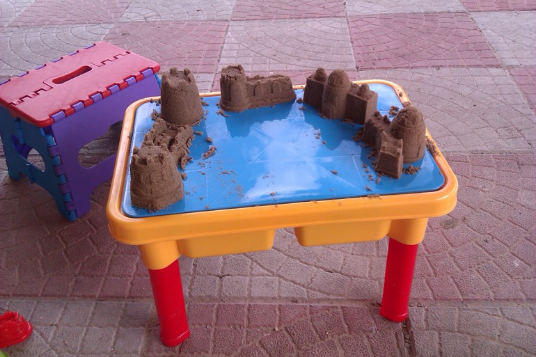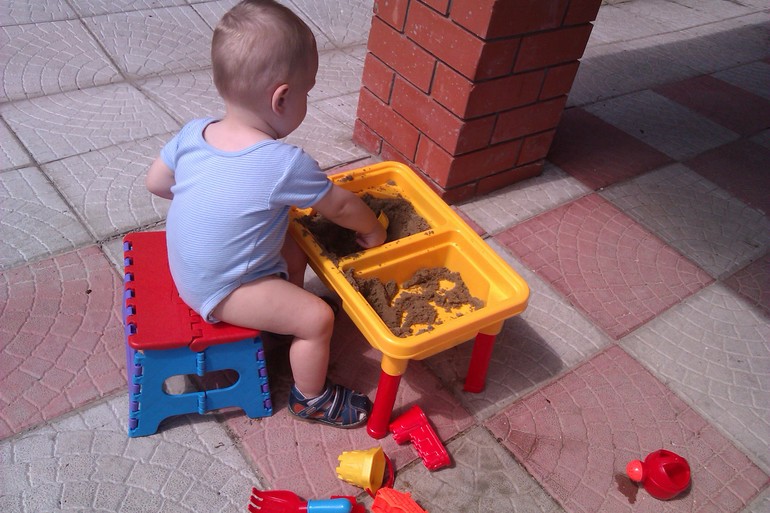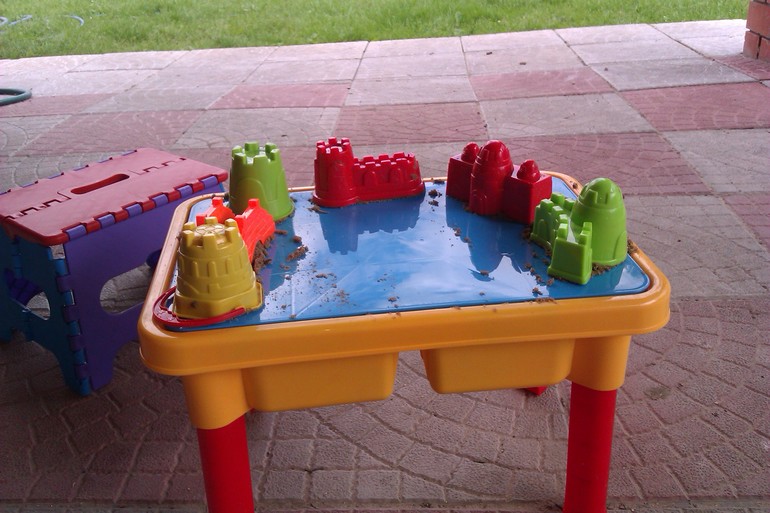 Какая же дача без собственной песочницы? Мы подумали и купили Никите столик-песочницу. В комплекте к нему идут формочки в виде стен и башенок замка. Сын был в восторге!