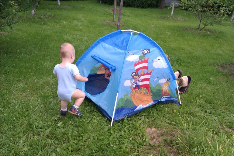Игры и игрушки для малышей от 1 года до 2х летКогда наступает долгожданное лето, хочется провести как можно больше времени на природе - в деревне. А так как едем туда с малышом, хочется, чтобы и там ему было интересно и весело! Мы долго не раздумывали и купили Никитке палатку, чтобы он мог там играть и прятаться от солнца.