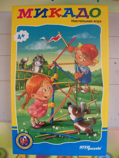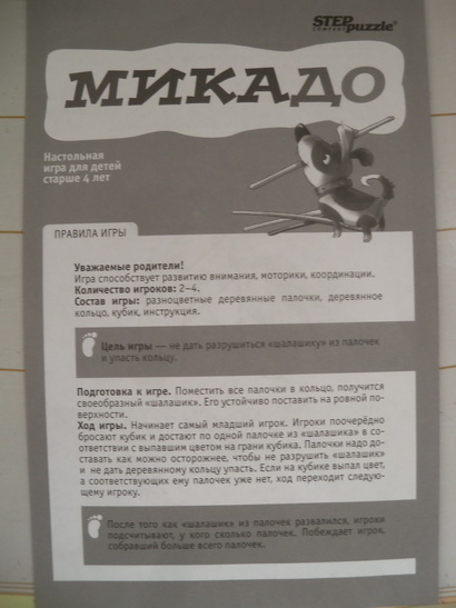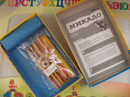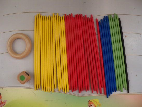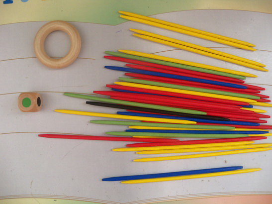 Вариант известной игры "Микадо". В наборе - разноцветные палочки, кубик, кольцо. Все предметы сделаны из дерева, палочки прокрашены хорошо, вообще претензий по качеству исполнения у меня нет.