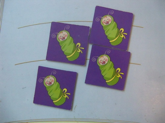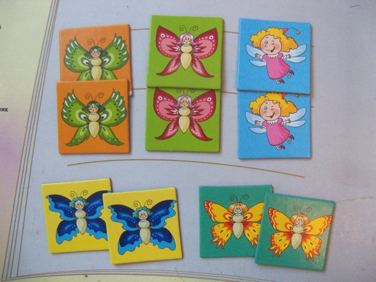 Небольшой бонус к игре - парные карточки с изображением бабочек. В инструкции предлагается использовать их для игры в мемори. У нас пока эта игра не идет, да и бабочки слишком маленькие и пестрые да еще и на цветном фоне, не самый удачный вариант для малышей. Ксюша придумывает с ними какие-то свои игры, перекладывает, переворачивает, что-то меняет.. В общем, по назначению мы их пока не используем. С обратной стороны у всех одинаковая картинка - гусеница-куколка.