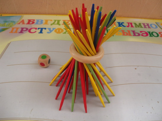 Суть игры - перед началом необходимо при помощи кольца сделать из палочек "шалашик". Затем игроки по очереди бросают кубик (на гранях которого изображены точки с цветом) и вытаскивают из шалашика палочку такого цвета, который выпал. Естественно, нужно вытащить аккуратно, чтобы шалашик не развалился. Дочка старается вытащить осторожно, но берет первую попавшуюся палочку нужного цвета (на самом деле, можно присмотреться как палочки стоят и выбрать ту, которая не является основной опорной. Но понять это для моей дочки еще сложно).