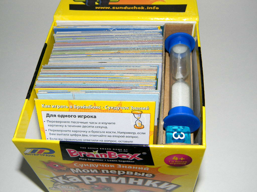В удобном сундучке, который закрывается на магнит, находятся 55 картинок с разной тематикой, песочные часы и кубик с цифрами. Карточки очень плотные, согнуть или помять их нереально, формат удобный, вообще игра очень красочная и качественная, все детали игры отлично сделаны!