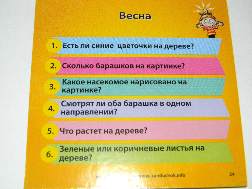- посмотри что на карточке нарисовано, например божьи коровки, какого они цвета, а сколько их и т.д. потом карточку забираю, переворачиваю и задаю сыну вопросы, которые написаны на карточке.