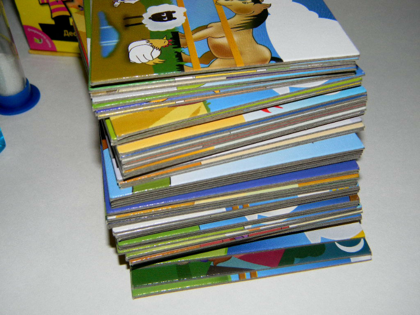 Берем карточку, любую, вытягивает сын, рассматривает её внимательно. Я ему подсказываю