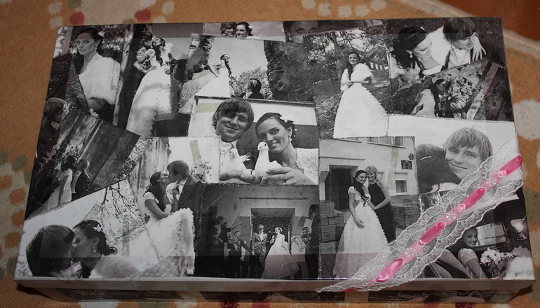 Коробка от аксис, фотки распечатаны на обычном принторе, по контуру обвела клеем с блестками, там хранятся вещи со свадьбы! подушечка для колец, чулки, ручник, альбом, книга пожеланий, лепески роз и т.д.! Я Софии хотела такую же сделать, чтобы мелочь с др хранить, но руки так и не дошли!!!