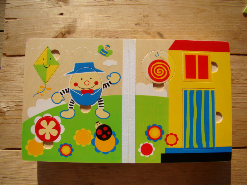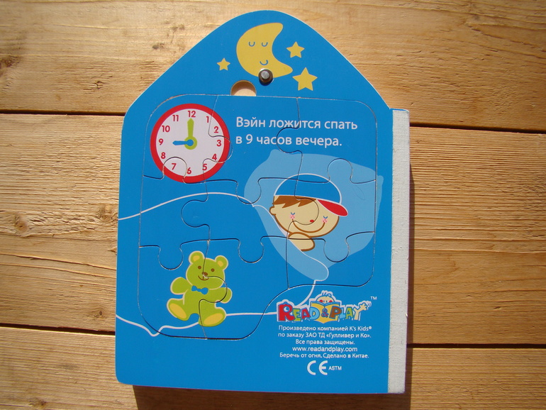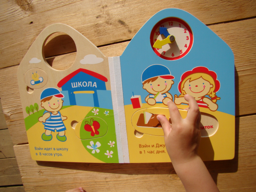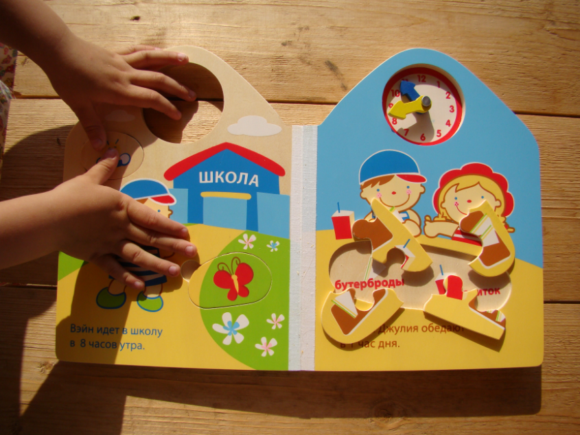 В ней не только вкладыши, но и 2 пазлика. Один на 4 элемента, другой, на последней странице, на 9 элементов. Стрелочки на часиках в первой книжке двигаются, в дальнейшем можно изучать время по этой книжке. По часикам из этой книжки научила дочку определять время, но пока только часы (ровно восемь, ровно 10 часов и т.д.)