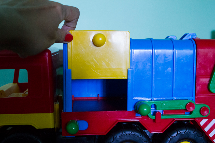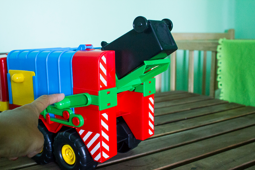 Это - самая генеральная машина! Большая. Мусорная. Бак на колесах, крышка открывается. Подъемный механизм для бака, задняя часть открывается и убирается. Есть открывающееся окошко.