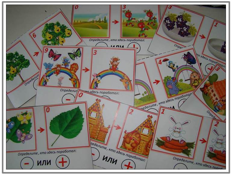 Карточки разной степени сложности, с разными вариантами сложения и вычитания. Мы занимаемся с ними так: берем одну карточку, рассматриваем ее, я рассказываю ей маленькую предысторию, о том, что было и что стало, а затем мы пытаемся определить, чьих здесь рук дело – плюса или минуса ( если вычли и забрали кого-то – значит минуса, если же стало больше, кого-то добавили, кто-то пришел, значит – плюс здесь поработал).