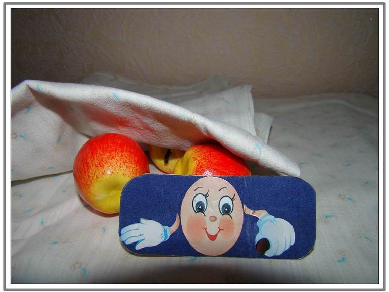 После этого, наш минус забирает все яблочки и прячет их под пеленочку (Даша сама прятала):