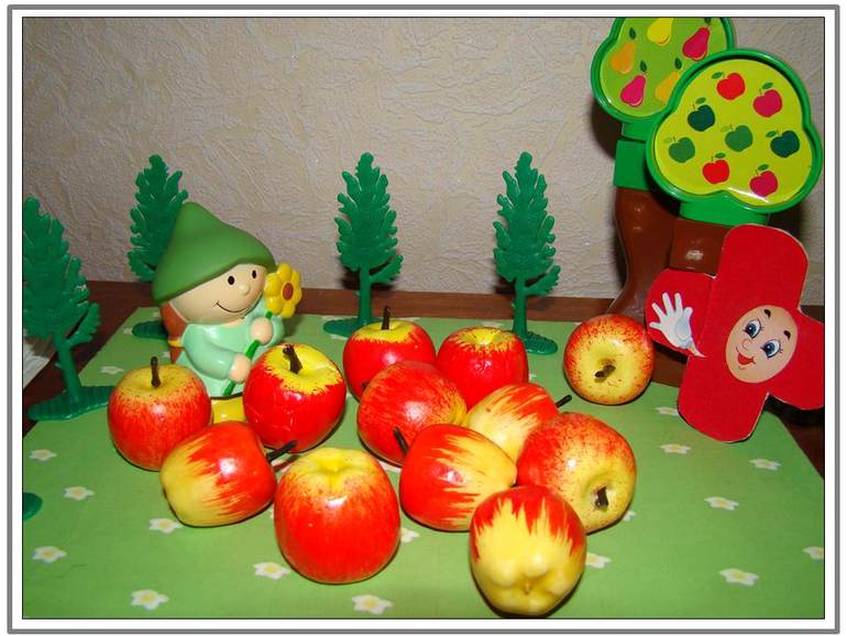Сделали мы предварительно небольшую лесную полянку, на которую положили 3 яблочка. И как-то раз мама сказала своей дочке: «Пойди в лес и собери яблок, будем варить компот». Шла-шла наша девочка и, наконец, пришла в лес. Видит яблонька, а на земле 3 яблочка лежат (пересчитали), обрадовалась девочка – будет, что маме принести.