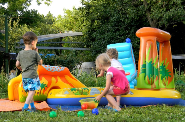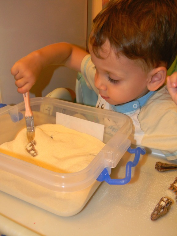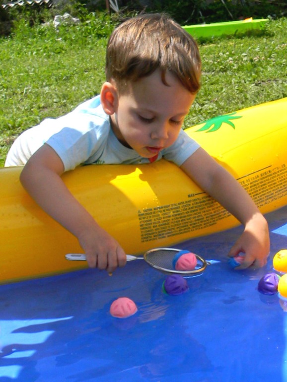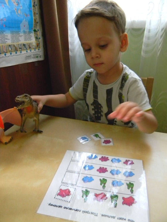 Закидывали в "пасть динозаврику" мячики, (ещё в меткости тренировались, закидывая кольца на кольцеброс)