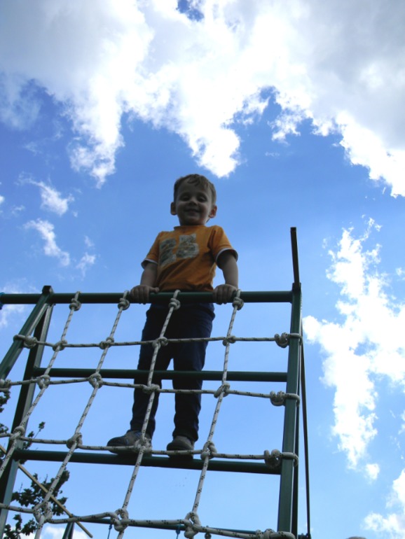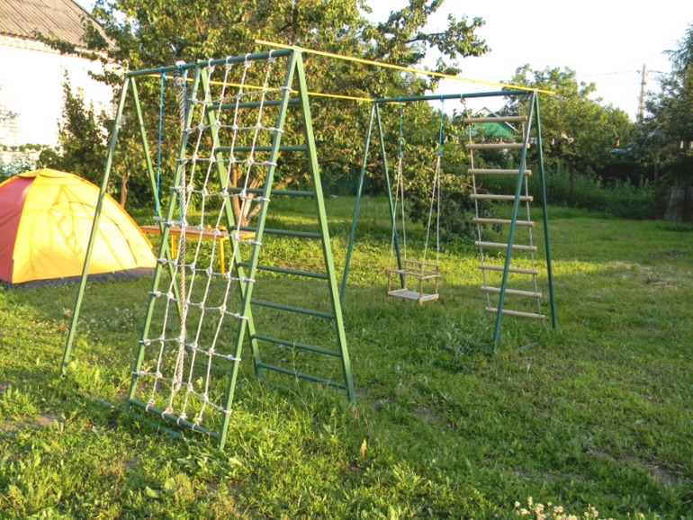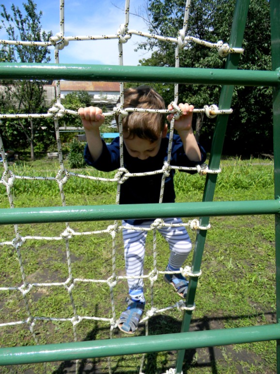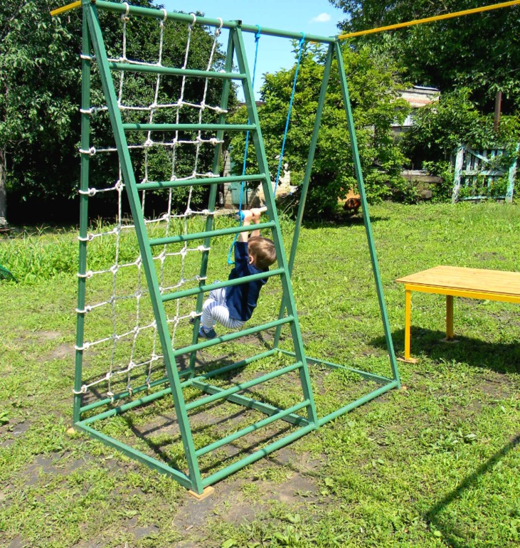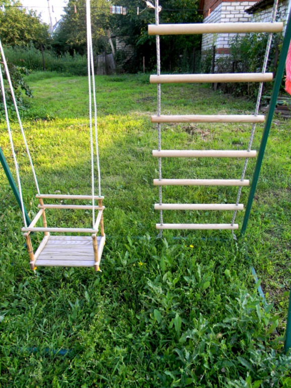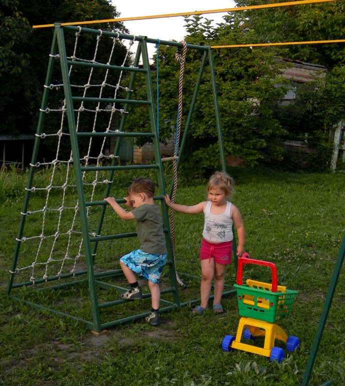 сделал из вот таких черенков и веревки.Качели вот такие взяли и он чуть переделал палочки (со старой бамбуковой удочки поставил, что бы удобней было). Трапецию вот такую покупала и канат вот такой, ещё заказала недавно кольца вот такие. А веревочную лестницу с этого фото он сам сплел из веревки.