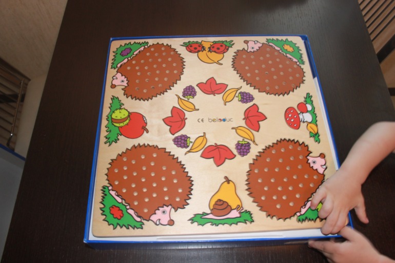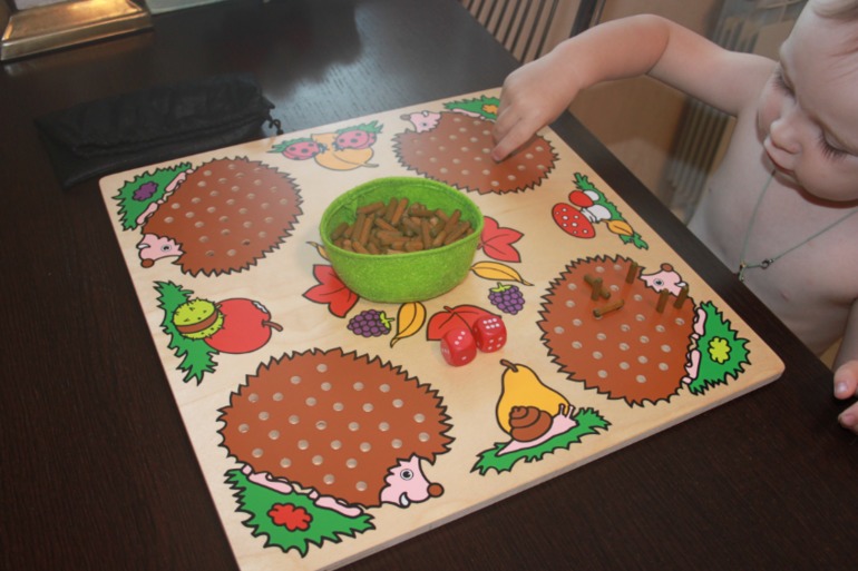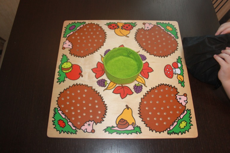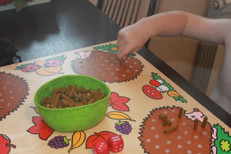 Лукошко устанавливается посередине поля и туда высыпаются иголки. Также есть два кубика: один с точками от 1-3, второй от 1-6. Правила игры простые: кидаются кости, сколько выпало точек столько ты ставишь иголок на своего ежа. Соответсвенно кто быстрей заполнит ежику иголки тот и победил. Вначале мы начинали играть используя лишь один кубик от 1-3х, потом играли только со вторым 1-6ти, и позже стали кидать оба))) Игра интересная. На фото видно, что маленький наш игрок с удовольствием старается попасть иголочкой в дырочку, поэтому под наблюдением взрослых малыши тоже могут развивать моторику.