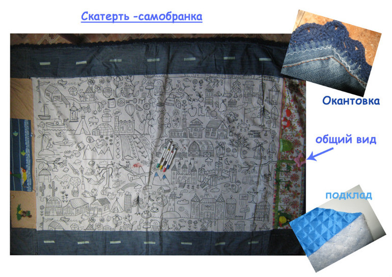 2. Набор для пикников. В него, кроме разноцветных чашек, столовых приборов, тарелочек-плошечек, бутербродницы и термоса, входит волшебный коврик для творчества, игр, перекусов и лежания под солнечным летним небом. Идея возникла после увиденных мною на ББ постов Анастасии http://www.babyblog.ru/community/post/igraem/1703545 с ее волшебными книжечками, Светы http://www.babyblog.ru/user/lenta/Suvimaca, у которой увидела я как-то замечательный сувенир: сшитый из ткани мобильный гараж с дорогой для мальчишек, и вот тут еще очень здорово такая же идея воплотилась http://horoshokogdavsevmeste.blogspot.ru/2012/11/blog-post_14.html, и Девочки, которая купила в ИКЕА ткань-раскраску http://www.babyblog.ru/community/post/igraem/1719889. Я объединила эти идеи и получилась наша «скатерть-самобранка».