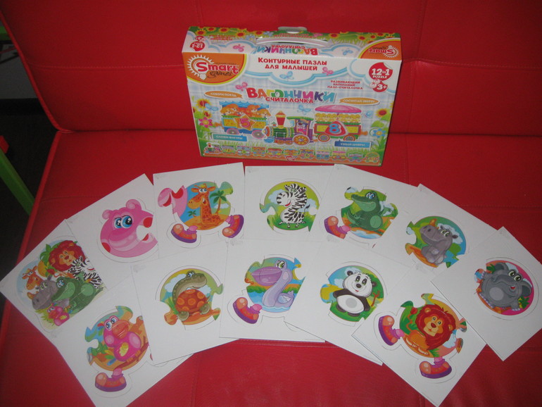 Двойственное впечатление. Идея – просто супер. Получается поезд из паровоза и 10 вагончиков (в каждом пассажиры от 1 бегемотика до 10 бабочек). Каждый вагончик имеет вкладыш в виде формы и цифры. Кроме того, есть еще небольшой бонусный пазлик-паровозик из 16 частей. Поезд получается длиннющий, больше 1,5 метров и яркий. Картинка приятная, звери мультяшные, но симпатичные. Но стыковка деталей, конечно, не такая подогнанная как в пазлах касторланд, поэтому иногда приходится помогать вставить некоторые формы-цифры.