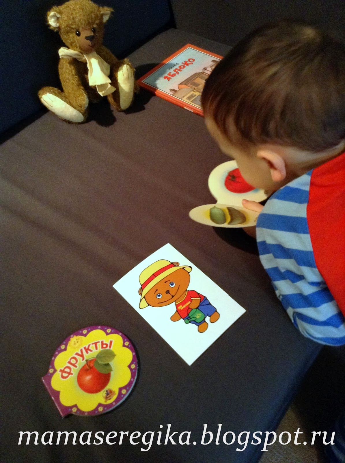 во время игры Сережа постоянно сверялся с двумя маленькими книжками - овощи и фрукты, что к чему относится, а потом я подглядела, как он сидит и по буковкам читает эти книжки!!! вот так было радостно мне)