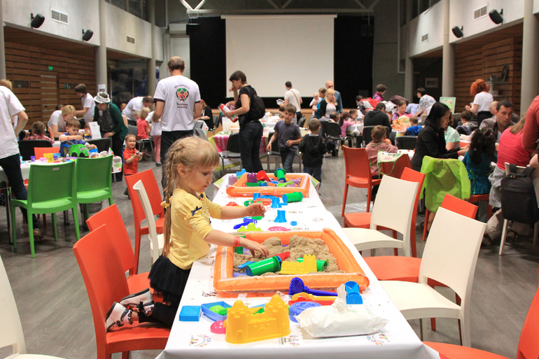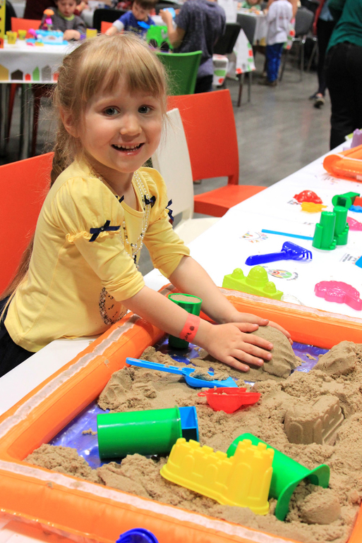 Впервые и я, и дочка поиграли с кинетическим и лунным песком. Возвращались к этому столу раза три, больше всего времени здесь провели, никак не могла уговорить дочу на другие столы обратить внимание. Мне больше кинетический песок понравился, приятнее на ощупь, он неожиданно тянуче-текучий, нежный...