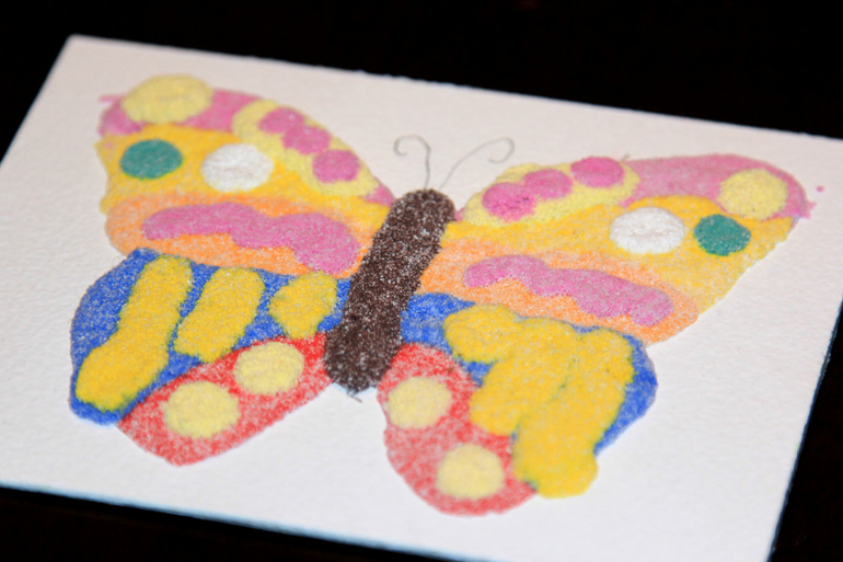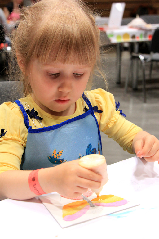 Еще на одном мастер-классе Сашу обучали кварцевой живописи. Очень интересная техника! там стояли картины автора этой техники - очень оригинальные! Суть процесса - нужный участок рисунка надо густо заполнить краской, засыпать ее мелким кварцевым песком, песок впитает в себя краску и застынет, получится объемный элемент рисунка. Этот элемент позже можно продолжить украшать по тому же принципу, получится многослойный объемный рисунок. Саша захотела рисовать бабочку, меня к процессу не допустила, сидела и старалась сама все сделать, я только краски ей помогала достать.Кварцевая живопись удивила - необычно, просто, эффектно. (я даже купила набор всего необходимого, чтобы сотворить что-нибудь дома)