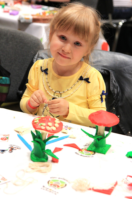 Мы начали с нового для нас материала - воска, лепили свечку "Мухомор". Резать воск оказалось достаточно трудно, пришлось помогать в основных моментах, зато украшательство досталось дочке, она даже божью коровку слепила, на листик посадила. Если бы на мастер-классе делали поделку помельче, Сашка бы сама справилась, а разогреть большой объем воска ей было трудно, вырезать нужные формы из воска - вообще невозможно. маленькие же детальки пошли хорошо - разогревала небольшие кусочки воска и лепила, как из пластилина. Интересный материал, мы уже купили один набор для домашних экспериментов. Ведущий мастер-класса был терпелив и доброжелателен, хотя, наверное, ему было тяжело объяснять одно и то же каждые пять минут все новым и новым людям.