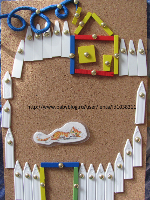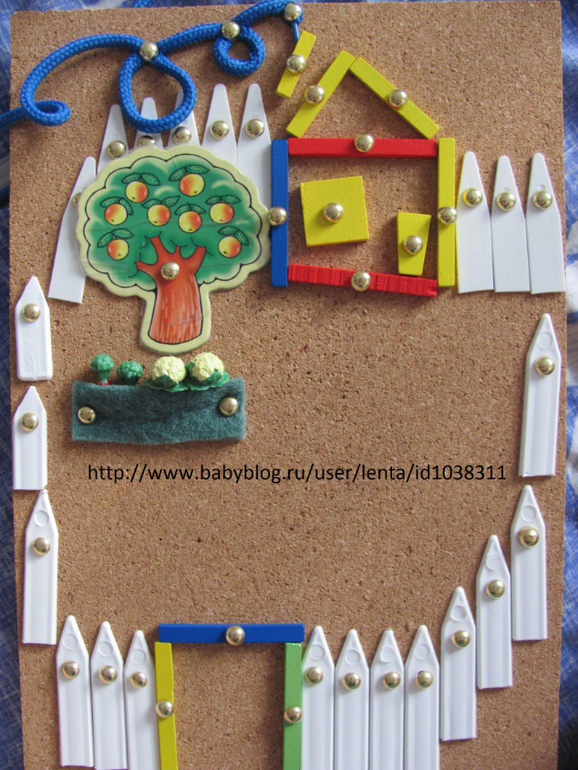 - Вот тебе окошки.- А где я гулять буду?- Вот тут.Девочка сделала забор вокруг домика (забор из садовых бирок)