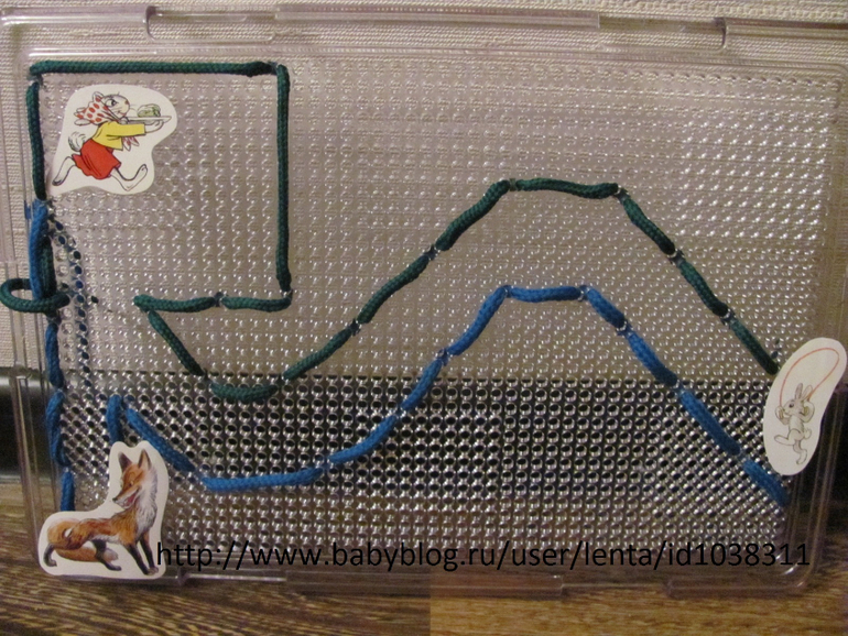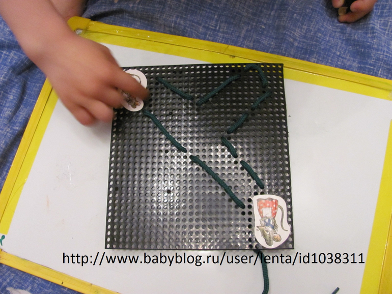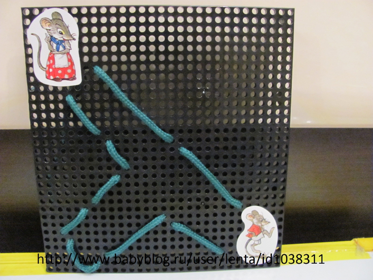 Здесь зашнуровали дорожку и проводили пальчиком по ней. Спрашивала куда хочет пойти мышонок - прямо или налево, а направо можно?