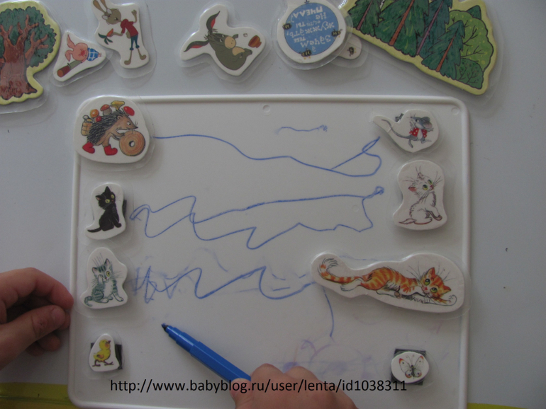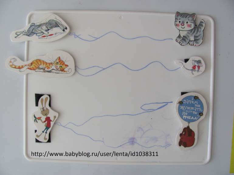 Далее с различными героями делаем соединялки с различными маленькими историями (например кот идет будить зайку, хочет поиграть, или кошка хочет догнать мышку). На доске для рисования и на героях прилепила липучки.