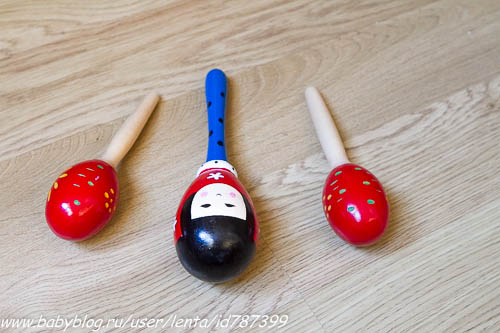 Кладу два маракаса, трясу один из них и прошу отгадать, какой из них звучал. В одном рис, в другом, я подозреваю, фасоль, разница есть, но уловить ее ребенку непросто.
