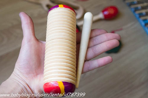 Я беру в руки любой инструмент, на фото гуиро, но, чаще всего, это маракас. Маракасы Кирюха не так ревностно охраняет от посягательств (их много:-) ) и начинаю играть. Кирилл берет второй маракас или другой инструмент и отвечает мне. Можно играть быстро или медленно, потряхивать инструмент мягко или жестко, мелко трясти или делать плавный взмах. Когда Кирюха был помладше, я комментировала все свои действия и делала долгую паузу, чтобы он мог вписаться. Очень интересно рассказывать на пару какую-нибудь историю, например, о том, что один маракас зовет другого пойти на пляж, где галька шуршит вот так (дробные потряхивания), а второй отвечает: да-да-да (три резких потряхивания).
