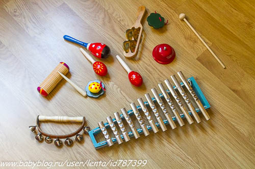 На фотографии металлофон, румба, гуиро, кастаньеты, колокольчики, маракасы и самостоятельно затесавшийся звоночек. Есть еще флейты и свистульки, две гитары и триола, но речь сегодня не о них.