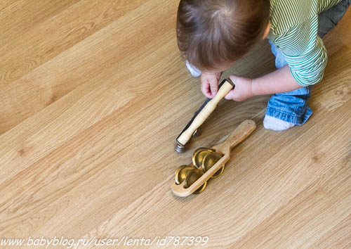 Когда Кирюха наигрался и перестает хвататься за инструменты при первой возможности, играем в игру " Кто так звучит". Я прошу Кирюху закрыть глаза или повернуться спиной, что сложнее, беру инструмент и играю. После этого прошу показать, на чем я играла. Изначально мы перебирали звучание, чтобы найти правильный источник звука.