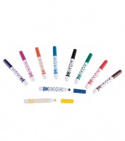 Называлось "двусторонние смываемые маркеры". Дома разочаровалась страшно! Во-первых, одна стороны в форме штампа, а вторая... в виде попы фломастера, наглухо закупорена, ничем и никак не пишет. Во-вторых, оказалось, что отмыть от рук, одежды и стола даже специальный перманентный текстильный маркер и то проще, чем эти детские смываемые, вот подстава! В-третьих, качество самих штампов очень грустное: даже у меня хороший и правильный оттиск получается в среднем один раз из 10! Что уж говорить про двухлетку...