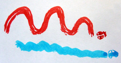 А. Берем штамп, печатаем и обсуждаем, почему он такой и из чего может быть сделана такая фигура. След - коричневый. Может, лапа в грязи измазалась? По сырой земле ходила? А может по шоколаду? Или это след на кожуре переспелого банана? А что еще бывает коричневым?.. Машинка синяя, почему? Она небесная машина? А, вечерне-небесная. Или морская? Или из папиных джинсов такую можно сделать? Или из твоего мячика?.. Заодно тренируем память, вспоминая все, что может быть такого цвета. Здесь тоже можно не ограничиваться стереотипами типа "синее - небо" (к слову, в Москве реально синим небо не бывает вообще; вот серым, сизым, голубым, серым, белесым, оранжевым, розовым, серым, желтоватым, черным, я серый упоминала?.. А вот чисто ультрамариновым - неа, это только втемяшивание в ребенковую голову общепринятых стандартов. Равно как и "голубая вода" - голубая она только на фотографиях моря, да и то невсякого, и бассейнов с голубой плиткой %))))), но и сравнивать с реальностью и ощущениями повседневности. Например, футболка у ребенка может быть и синяя, и белая, и розовая... А вот желтой быть не может, нету такой в гардеробе %))) в общем, цветовое пространство - полезный полигон.
