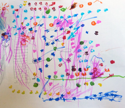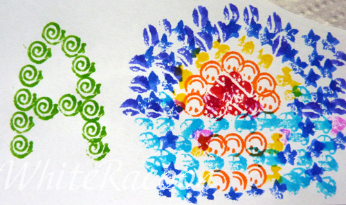 Б. Осваиваем легкий намек на пуантилизм. Выстраиваем правильные отштамповки в линии... Получаем буквы (моя обожает буквы, потому их в пример и привожу) из машинок и уточек, так же никто не мешает рисовать "закат в море" при помощи звезд и машинок в качестве моря, божьих коровок с сердечками в качестве солнца и смайликов с уточками в роли отблесков на облаках.