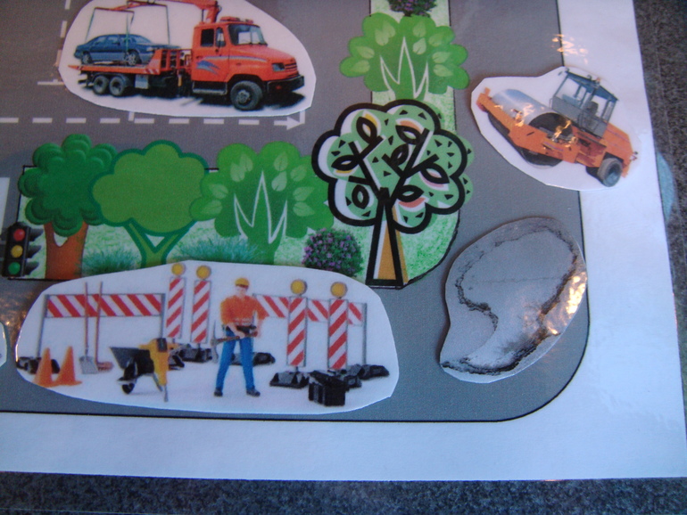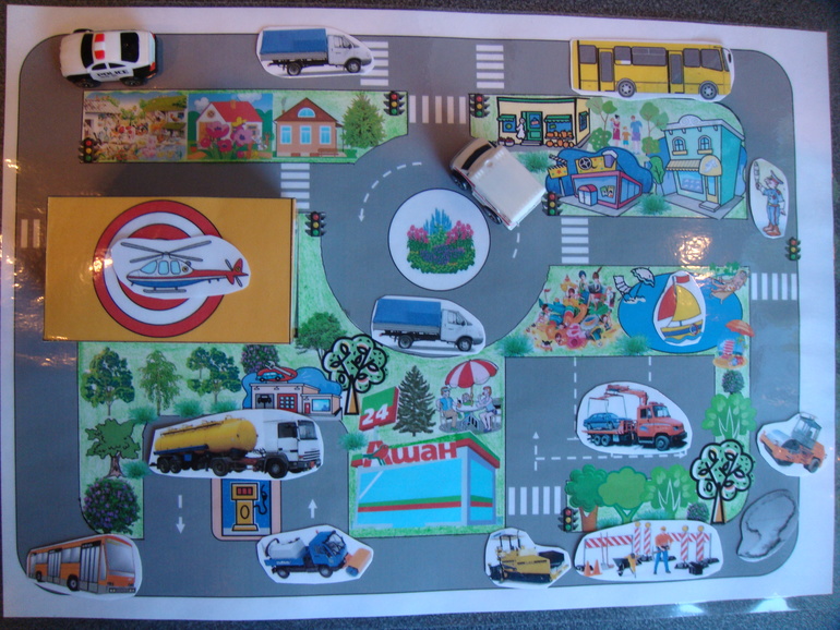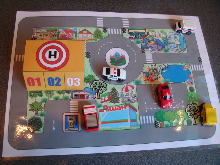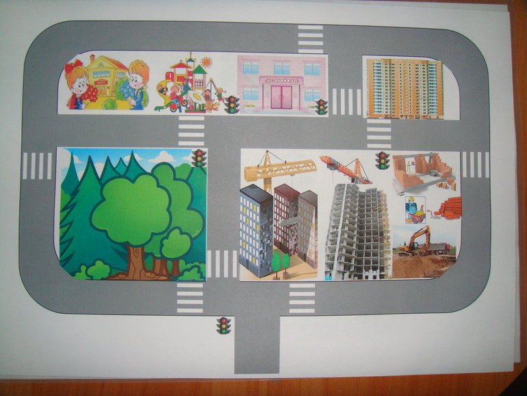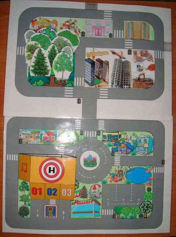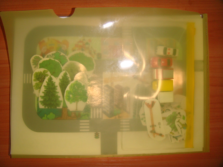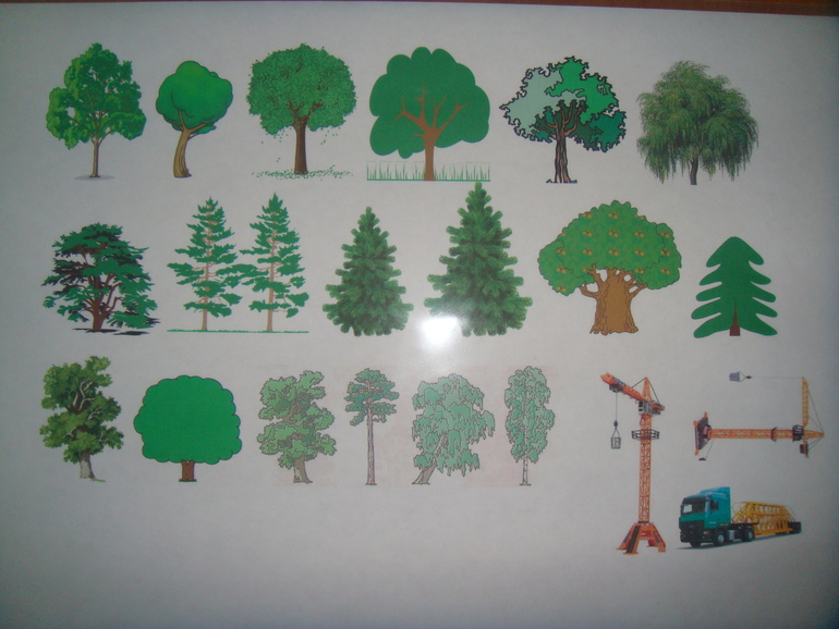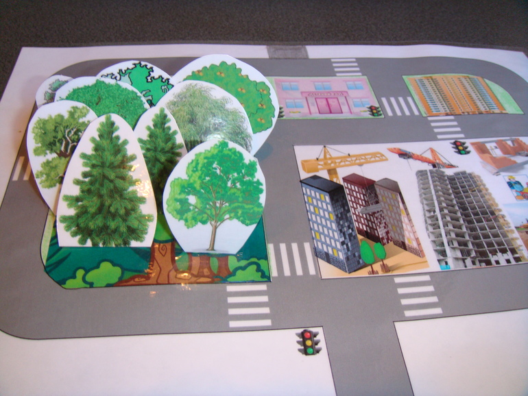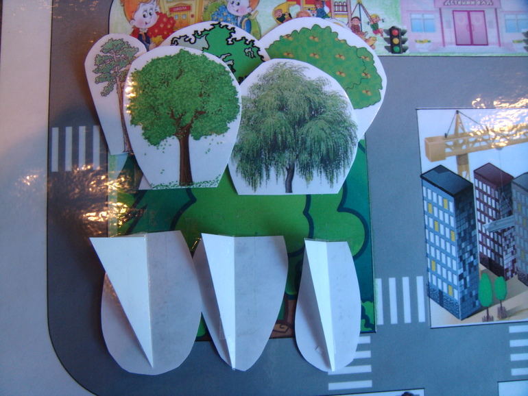 Здесь у нас детский сад, школа, детская площадка, жилмассив, большая стройка и лес. Он тоже объемный. Приготовила для него деревья различных видов: