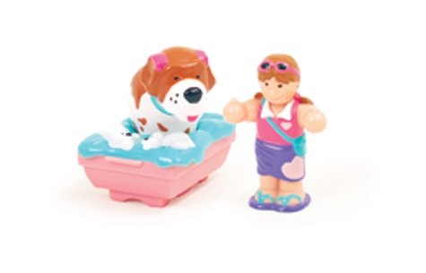 В набор входят машина, фигурка девочки, собачка и лежак для нее. Все фигурки можно вынимать из машинки.