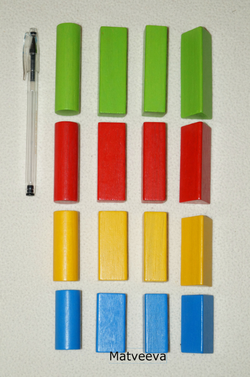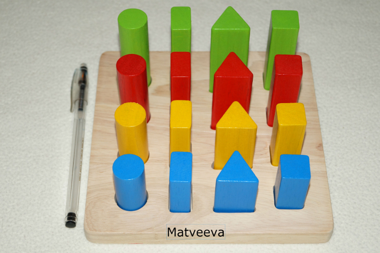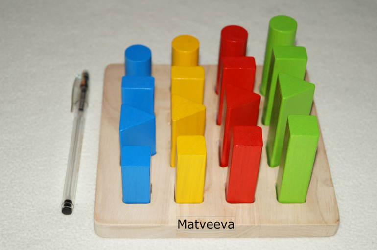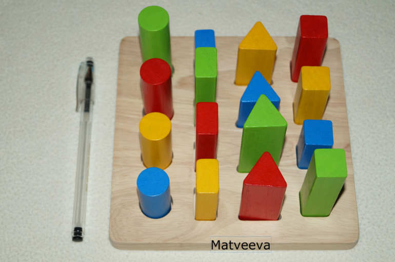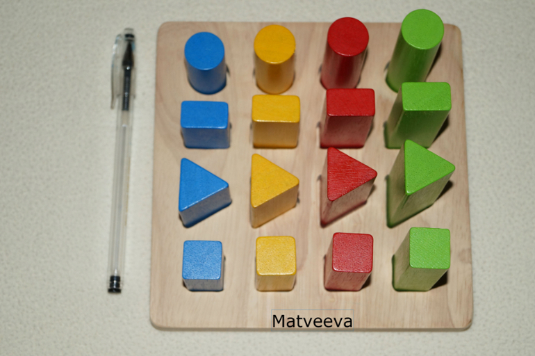 Потом я объяснила ей, что в одном ряду должны располагаться фигуры одного цвета) и мы тренировались вот так)